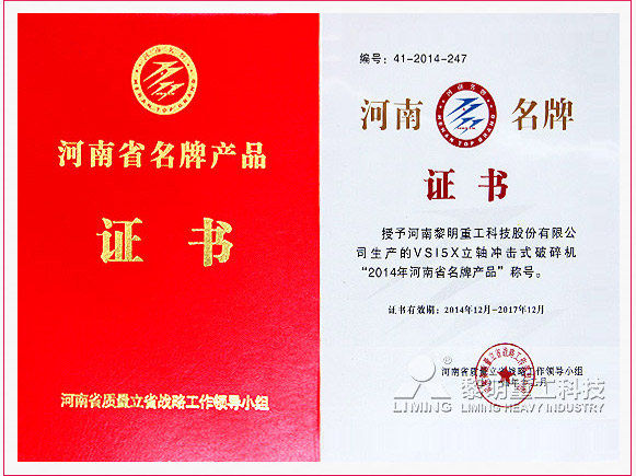 2015,羊年伊始,VSI5X斗志昂揚(yáng),斬獲“河南省名牌產(chǎn)品”稱號(hào),也是繼2014年摘得河南省科技進(jìn)步三等獎(jiǎng)后,又一次憑借硬實(shí)力成為眾人矚目的焦點(diǎn)。“名牌產(chǎn)品”由省質(zhì)量立省戰(zhàn)略工作領(lǐng)導(dǎo)小組進(jìn)行嚴(yán)格評(píng)審,經(jīng)過企業(yè)申報(bào)、資料審查、顧客滿意度調(diào)查、專家認(rèn)定、領(lǐng)導(dǎo)小組審定、公告等程序,在全省10個(gè)主要行業(yè)中評(píng)選出336個(gè)名牌產(chǎn)品,VSI5X立軸沖擊破成功入列。